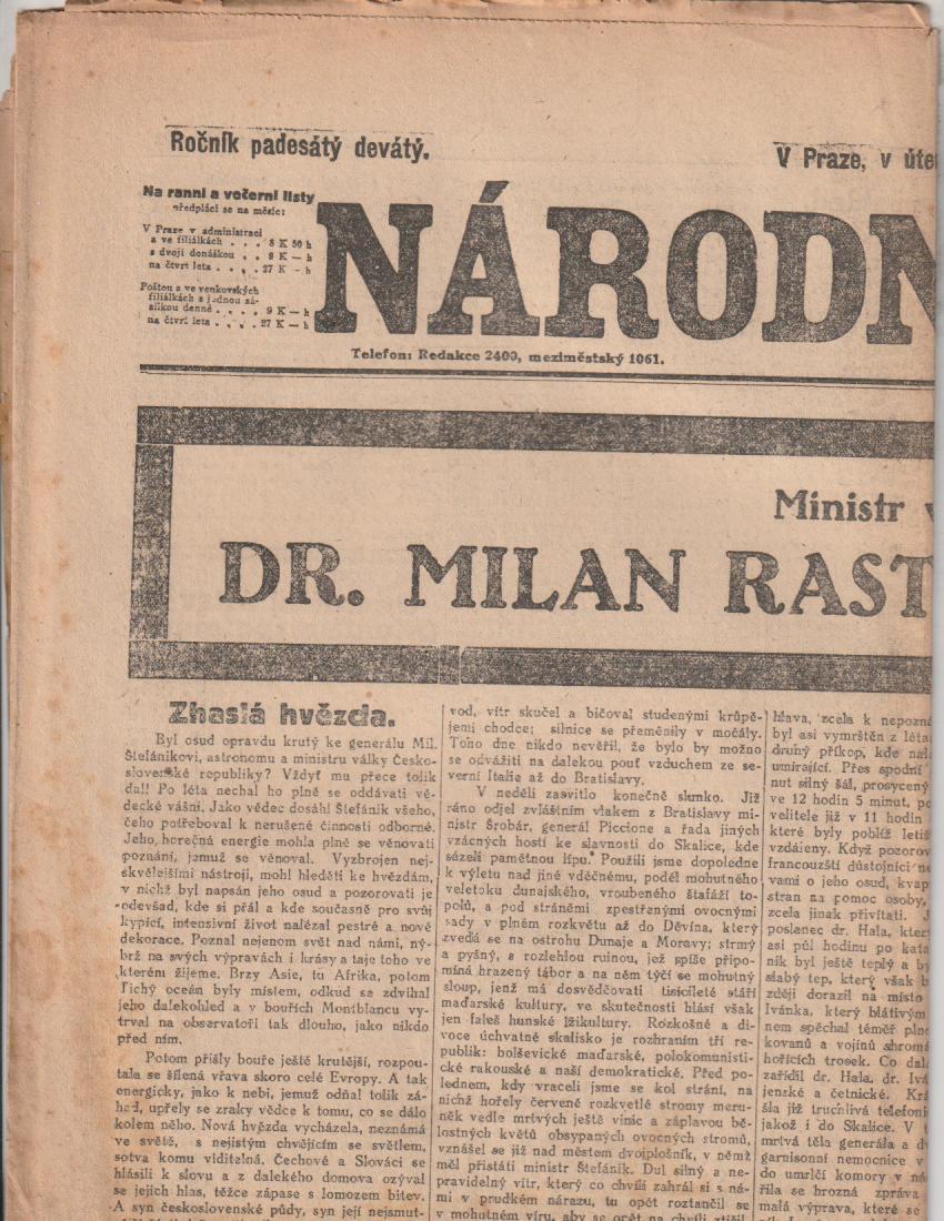 | Pozn.: | přeloženo, úmrtí Milana Rastislava Štefánika |